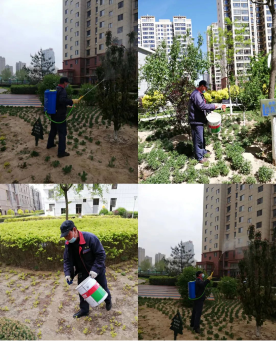 五、五月,持續(xù)對(duì)小區(qū)綠化進(jìn)行打藥施肥養(yǎng)護(hù)。