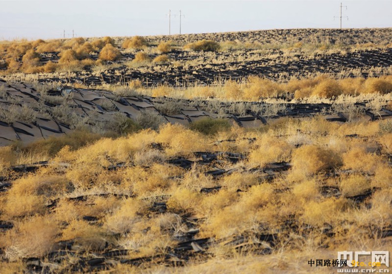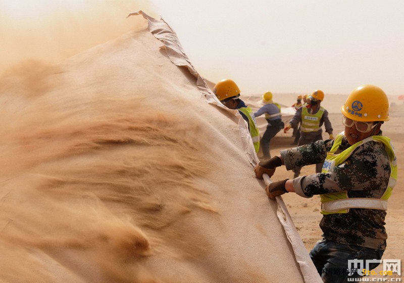 沙漠龍:在巴丹吉林沙漠,沙土每年平均移動速度大約有18米,如果不固定住移動沙丘,流沙很容易覆蓋公路。固沙關(guān)鍵是一個個2米長、20公分寬的填充式黑色沙袋。這些沙袋呈田字形交叉疊放,然后形成一個個1平方米的小方格,連成一片。沙袋在設(shè)計(jì)很特別,是有鰭沙袋,編織袋邊沿會留出3公分的穗兒,別小看這些穗,不單能減小風(fēng)速,還能把吹起來的沙留在框格內(nèi)。沙袋的面料采用的是耐寒耐曬材質(zhì),至少可以保持20年。第一項(xiàng)目部工程師王大偉說,根據(jù)風(fēng)向,不同路段、不同方向鋪設(shè)的沙袋群,寬度都有精確計(jì)算。