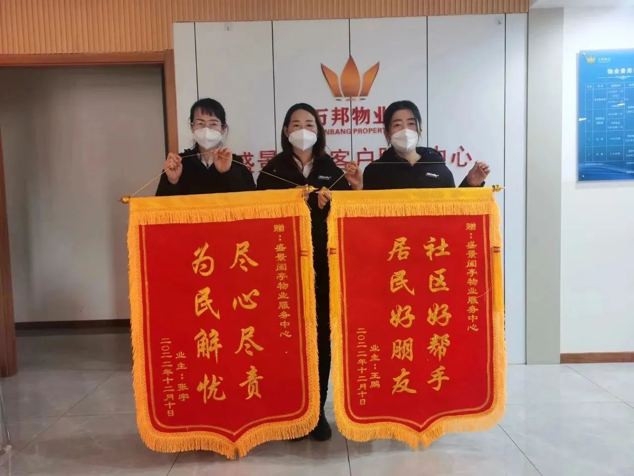 12月12日下午,業(yè)主手持著兩面“社區(qū)好幫手,居民好朋友”“盡心盡責,為民解憂”的錦旗,代表被困業(yè)戶與自己感謝盛景蘭亭物業(yè)服務中心的工作人員,在這特殊時期里,能全心全意不懼危險給予業(yè)主關心與幫助,服務中心管家用真心服務換來了業(yè)主的信賴與感謝。
