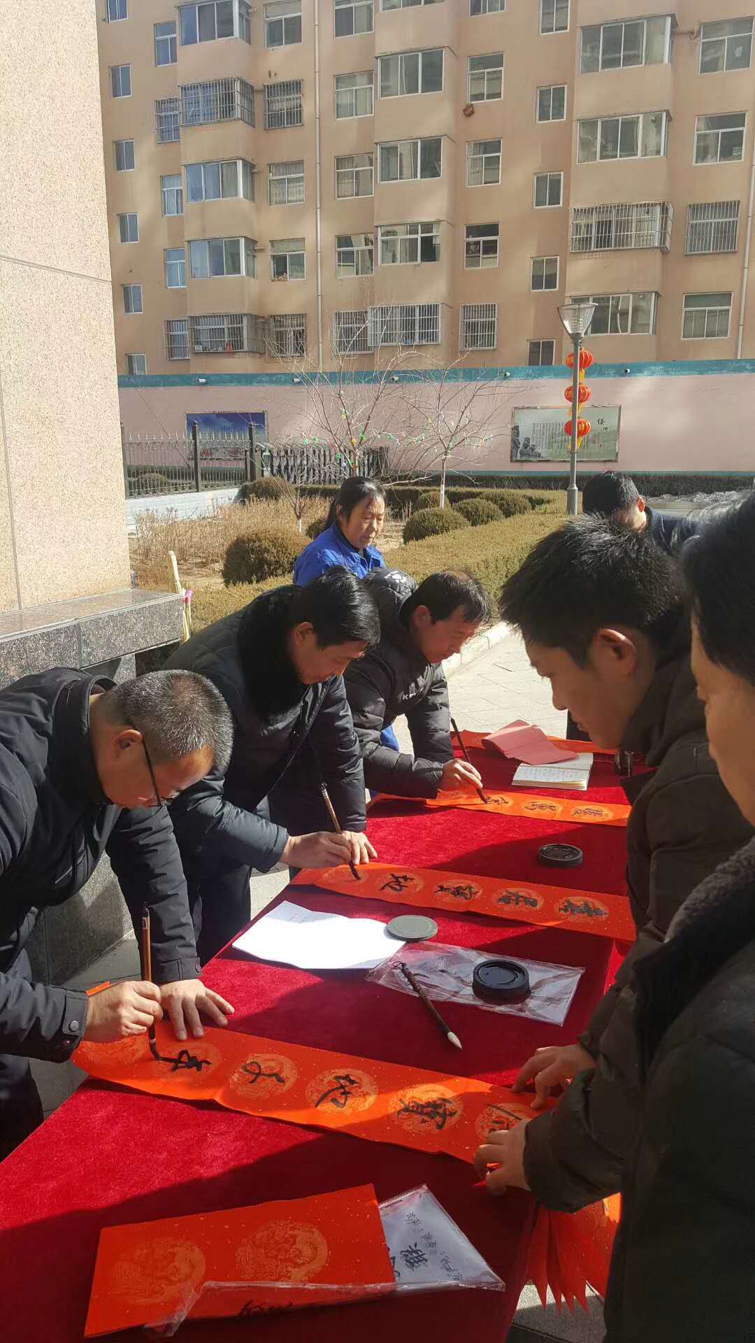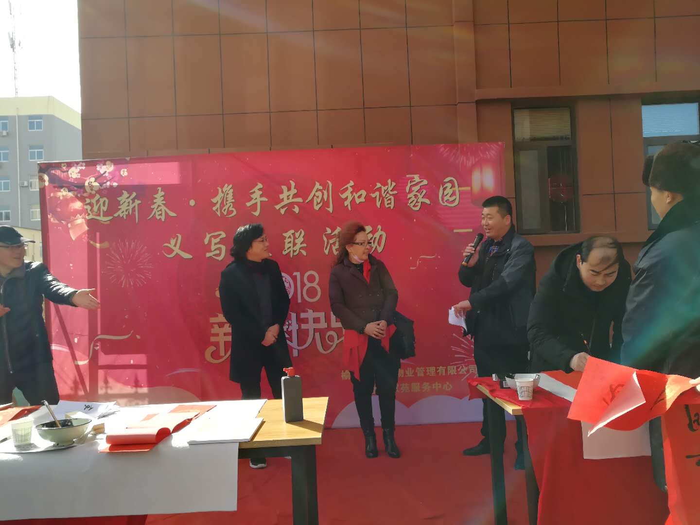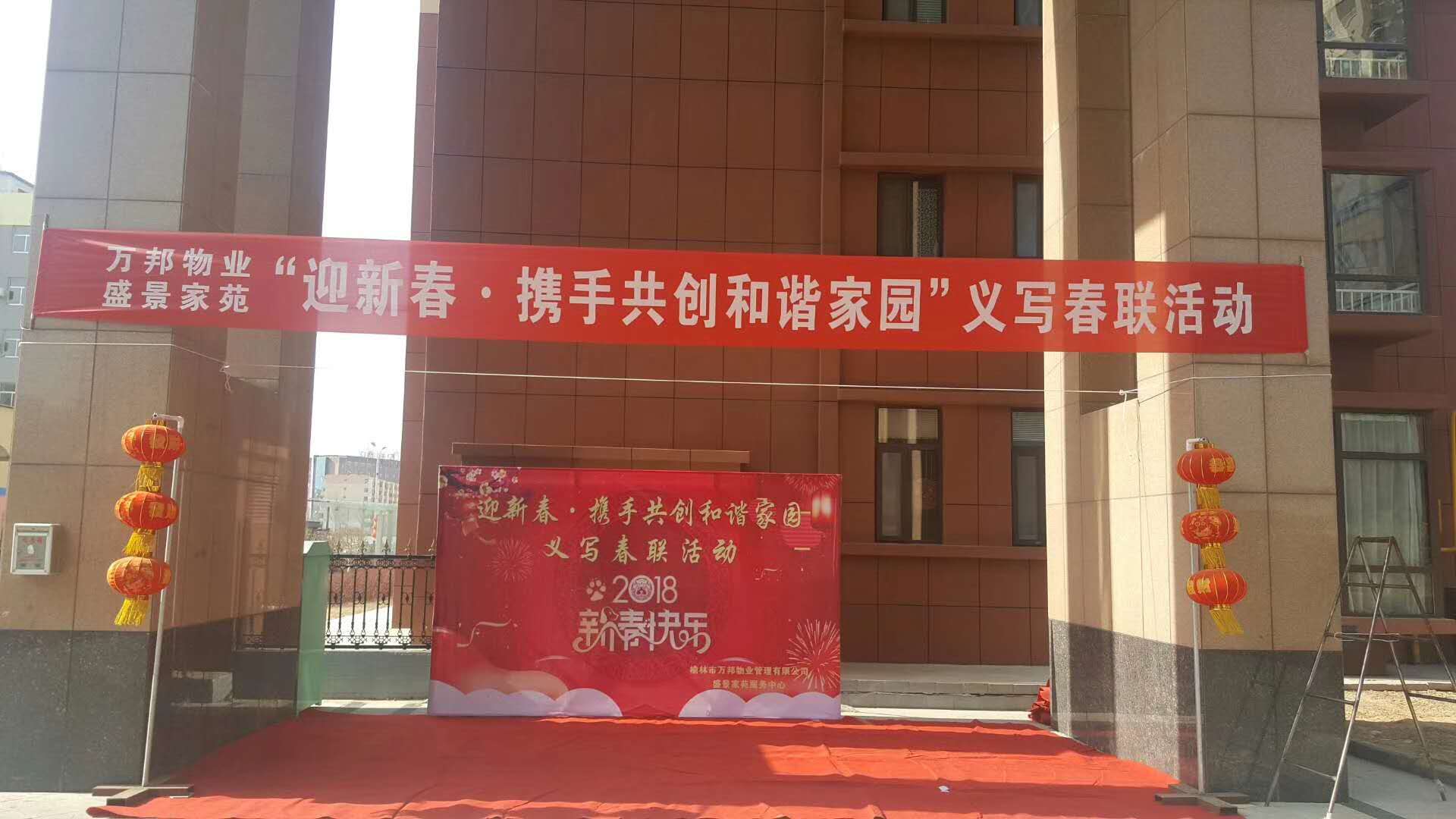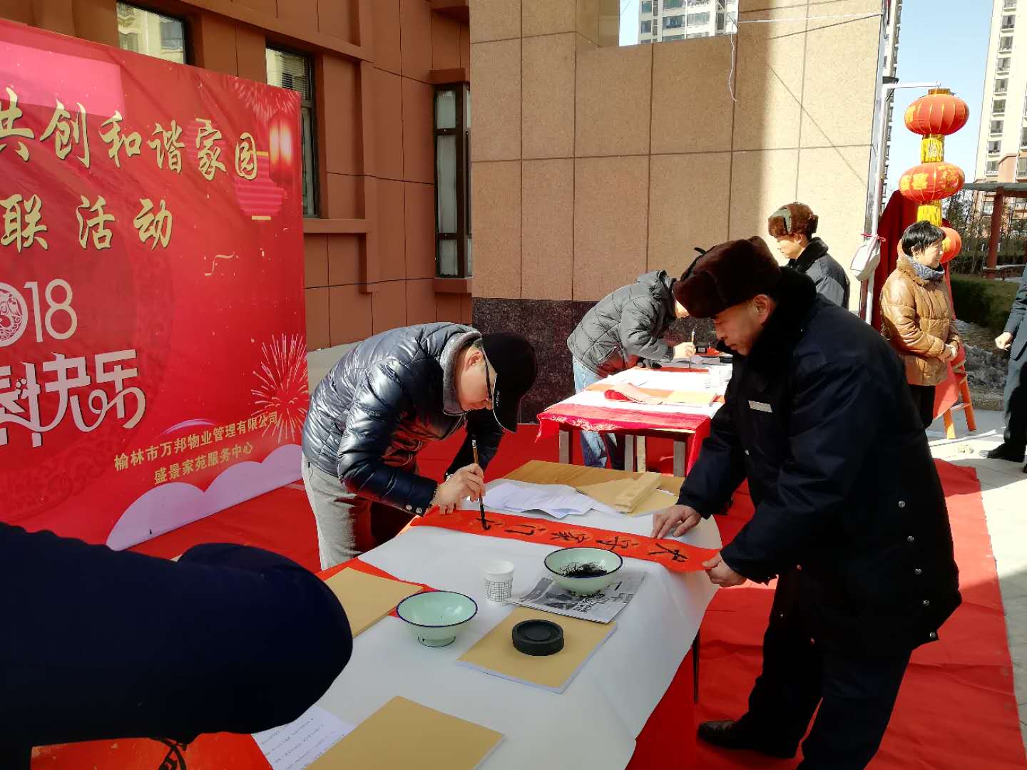 公司為喜迎新春,營造歡樂和諧的春節(jié)節(jié)日氛圍,同時增進業(yè)主的鄰里關系,進一步弘揚傳統文化,榆林市萬邦物業(yè)管理有限公司于2018年2月8日舉辦了盛景家苑小區(qū)“迎新春·攜手共創(chuàng)和諧家園”義寫春聯活動。