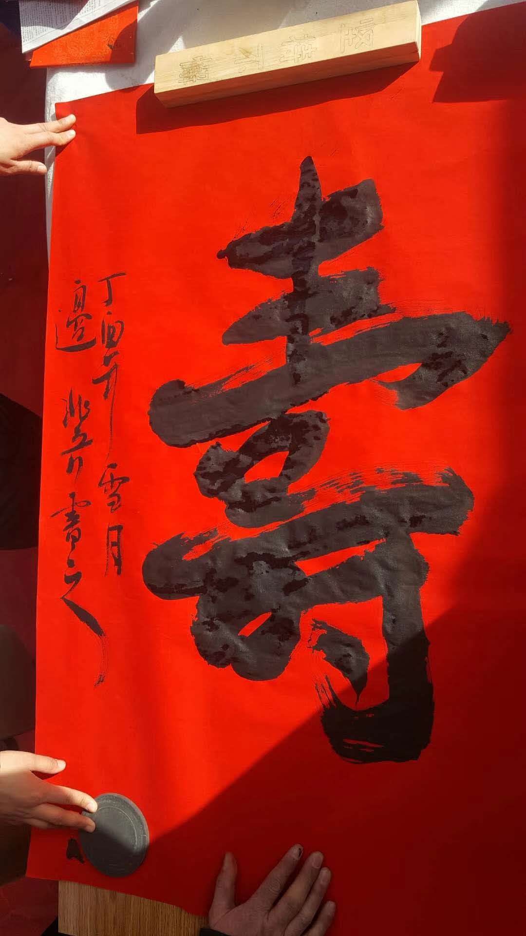 書法家們揮毫潑墨,書寫了多幅大紅春聯,其中拓宏飛先生為盛景家苑全體業(yè)主書寫了大大的“?!弊郑磉_對全體業(yè)主的美好祝愿。