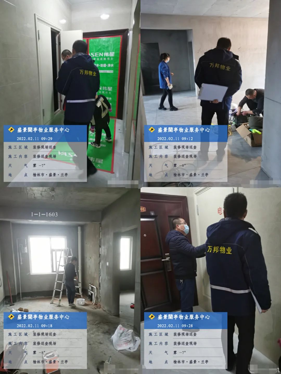 入戶查看業(yè)戶裝修進(jìn)度,檢查是否有違章情況,并將檢查情況詳細(xì)記錄!