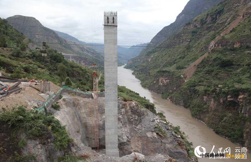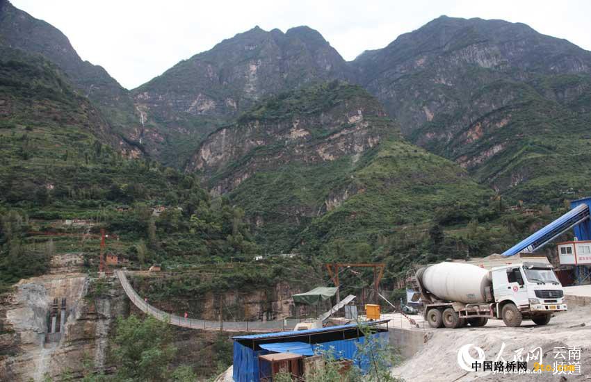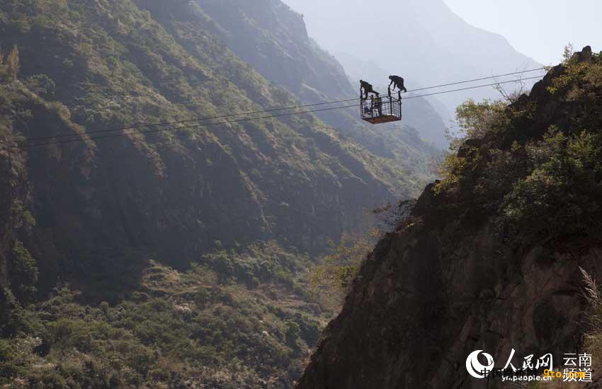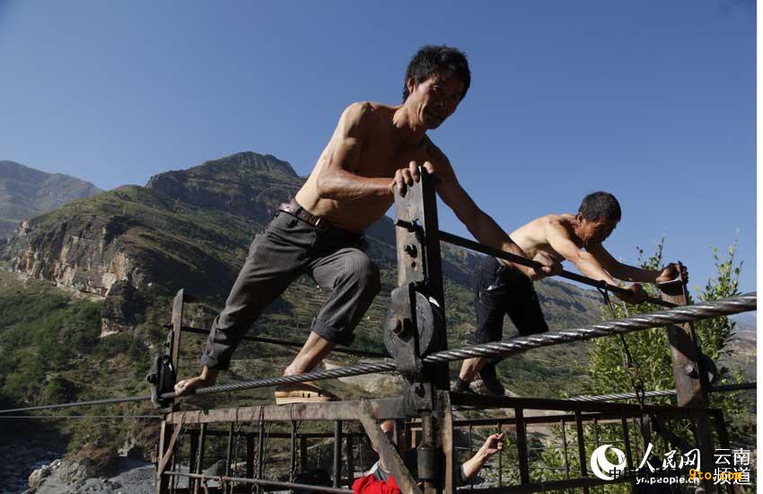 運(yùn)輸工程材料的簡(jiǎn)易吊橋已經(jīng)修通,村民可以從橋上通過(guò)。圖/人民網(wǎng)云南頻道